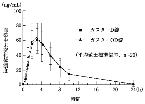 ヒトにガスターD錠20mg又はガスターOD錠20mgを経口投与した場合、投与後約3時間に最高血中濃度に達する。血中消失半減期は、約3時間である。それぞれの剤形で血中濃度の推移はほぼ同じであり、生物学的に同等である4),5)。