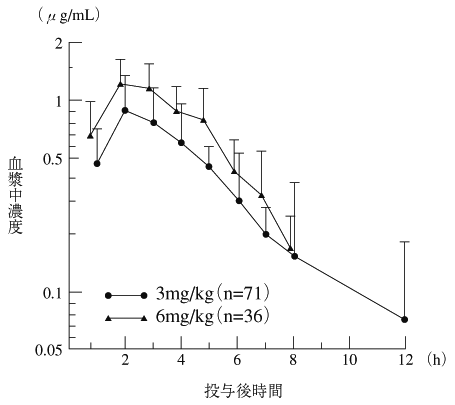 小児28例に3mg(力価)/kgを食後に単回経口投与すると、3.6時間後に0.63μg/mLの最高血漿中濃度が得られ、食後投与では吸収がやや低下した2) 。