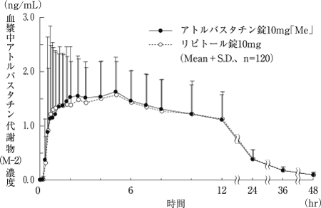 健康成人6例にアトルバスタチン錠10及び40mgを単回経口投与したとき、血漿中にアミド結合位置のベンゼン環の4位の水酸化体(M-1)及び2位の水酸化体(M-2)の2種類が確認されているが、血漿中主活性代謝物はM-2であった7)。アトルバスタチンの主要代謝臓器は肝臓であり、M-1及びM-2はCYP3A4によって生成することが明らかにされている7)。