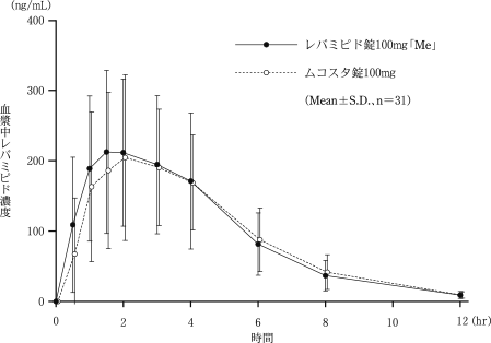 レバミピド錠100mg「Me」とムコスタ錠100mgを、クロスオーバー法によりそれぞれ1錠(レバミピドとして100mg)健康成人男子に絶食単回経口投与して血漿中未変化体濃度を測定し、得られた薬物動態パラメータ(AUC、Cmax)について90%信頼区間法にて統計解析を行った結果、log(0.8)~log(1.25)の範囲内であり、両剤の生物学的同等性が確認された1)。