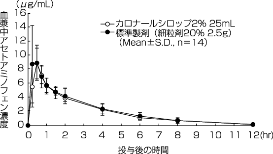 クロスオーバー法により、健康成人男性に、カロナールシロップ2% 25mLと標準製剤(細粒剤20%)2.5g(アセトアミノフェンとして500mg)をそれぞれ空腹時単回経口投与して血漿中アセトアミフェン濃度を測定した。その結果、標準製剤に比べてTmaxに差がみられ、吸収がやや遅れる傾向が認められたが、得られた薬物動態パラメータ(AUC、Cmax、t1/2)については生物学的同等性が確認された2)。
