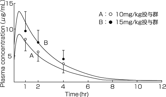 血漿中アセトアミノフェン濃度測定データより血漿中濃度推移をシミュレーションにより図示。