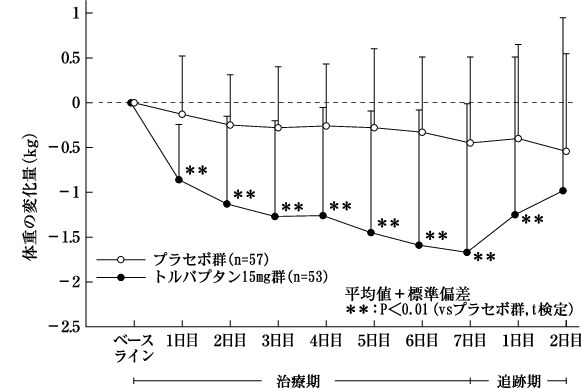 トルバプタンは、ラット肝硬変腹水モデルにおいて、腹水の指標である体重及び腹囲を減少させた36)。