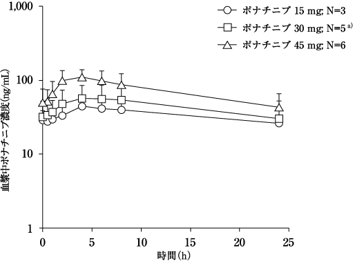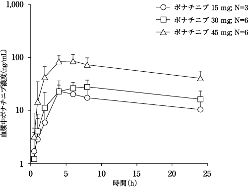 ダサチニブ若しくはニロチニブによる治療に抵抗性若しくは不耐容の慢性骨髄性白血病患者(CML)、又はチロシンキナーゼ阻害剤(TKI)による前治療に抵抗性又は不耐容のフィラデルフィア染色体陽性急性リンパ性白血病患者(Ph+ALL)35例を対象に実施した非盲検試験において、本剤45mgを1日1回経口投与した。慢性期慢性骨髄性白血病(CP-CML)患者における主要評価項目である12箇月までの細胞遺伝学的大奏効(MCyR)率は64.7%(11/17例)であり、移行期慢性骨髄性白血病(AP-CML)、急性転化期慢性骨髄性白血病(BP-CML)及びPh+ALLにおける主要評価項目である6箇月までの血液学的大奏効(MaHR)率は61.1%(11/18例)であった3)。副作用発現頻度は、35例中34例(97.1%)であった。主な副作用は、発熱17例(48.6%)、血小板数減少16例(45.7%)、高血圧13例(37.1%)、リパーゼ増加11例(31.4%)及び好中球数減少10例(28.6%)であった。