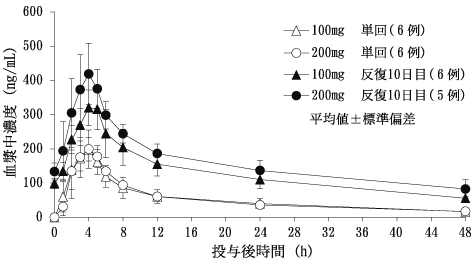 健康成人に本剤100mg又は200mg注)を食後に単回及び1日1回10日間反復経口投与した時の未変化体の血漿中濃度推移及び薬物動態パラメータを図16-1及び表16-1に示す。健康成人に本剤100mg又は200mgを1日1回食後反復経口投与した時の未変化体の血漿中濃度は10日以内に定常状態に達し、約2倍の累積がみられた3)。
