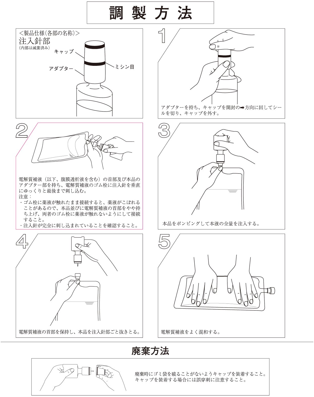 電解質補液の補正用として、体内の水分、電解質の不足に応じて電解質補液に添加して点滴静脈内注射するか、腹膜透析液に添加して腹腔内投与する。