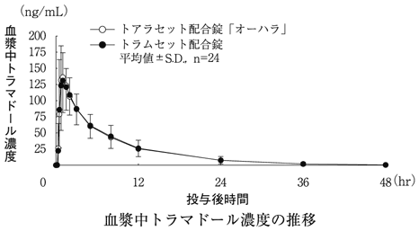 健康成人にトラマドール塩酸塩/APAP配合錠3錠注)(トラマドール塩酸塩として112.5mg、APAPとして975mg)を高脂肪食後及び空腹時にそれぞれ単回経口投与したとき、(±)-TRAM、(±)-M1及びAPAPの薬物動態に食事による顕著な影響は認められなかった3)(外国人データ)。