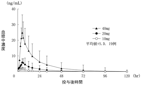 副作用発現頻度は、20mg群で75.0%(99/132例)及び40mg群で82.8%(111/134例)であった。主な副作用は、20mg群では傾眠41.7%(55/132例)、浮動性めまい18.2%(24/132例)、悪心18.9%(25/132例)及び頭痛11.4%(15/132例)、40mg群では傾眠38.8%(52/134例)、浮動性めまい30.6%(41/134例)、悪心21.6%(29/134例)、頭痛15.7%(21/134例)、便秘15.7%(21/134例)及び倦怠感10.4%(14/134例)であった34),35)。