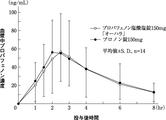 プロパフェノン塩酸塩錠150mg「オーハラ」とプロノン錠150mgを、クロスオーバー法によりそれぞれ1錠(プロパフェノン塩酸塩として150mg)健康成人男子に絶食単回経口投与して血漿中未変化体濃度を測定し、得られた薬物動態パラメータ(AUC、Cmax)について統計解析を行った結果、両剤の生物学的同等性が確認された3)。