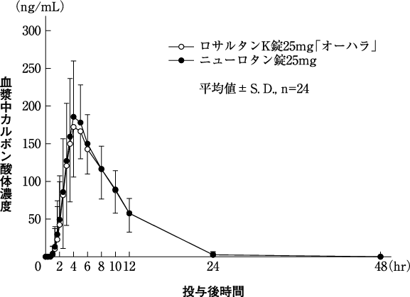 ロサルタンK錠25mg「オーハラ」とニューロタン錠25mgを、クロスオーバー法によりそれぞれ1錠(ロサルタンカリウムとしてそれぞれ25mg)健康成人男子に絶食単回経口投与して血漿中活性代謝物(カルボン酸体注))濃度を測定した。得られた薬物動態パラメータ(AUC、Cmax)について90%信頼区間法にて統計解析を行った結果、log(0.80)~log(1.25)の範囲であり、両剤の生物学的同等性が確認された7)。