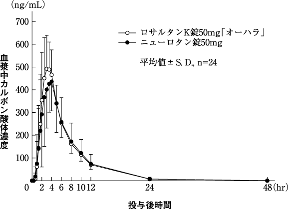 ロサルタンK錠50mg「オーハラ」とニューロタン錠50mgを、クロスオーバー法によりそれぞれ1錠(ロサルタンカリウムとしてそれぞれ50mg)健康成人男子に絶食単回経口投与して血漿中活性代謝物(カルボン酸体注))濃度を測定した。得られた薬物動態パラメータ(AUC、Cmax)について90%信頼区間法にて統計解析を行った結果、log(0.80)~log(1.25)の範囲であり、両剤の生物学的同等性が確認された7)。