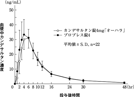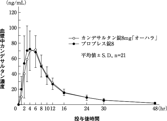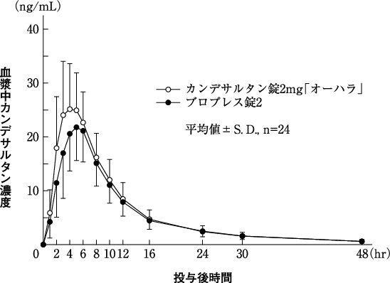 カンデサルタン錠12mg「オーハラ」とブロプレス錠12を、クロスオーバー法によりそれぞれ1錠(カンデサルタン シレキセチルとしてそれぞれ12mg)健康成人男子に絶食単回経口投与して血漿中活性代謝物(カンデサルタン)濃度を測定し、得られた薬物動態パラメータ(AUC、Cmax)について90%信頼区間法にて統計解析を行った結果、log(0.80)~log(1.25)の範囲であり、両剤の生物学的同等性が確認された6)。