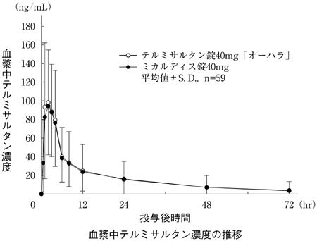 テルミサルタン錠40mg「オーハラ」とミカルディス錠40mgを、クロスオーバー法によりそれぞれ1錠(テルミサルタンとして40mg)健康成人男子に絶食単回経口投与して血漿中未変化体濃度を測定し、得られた薬物動態パラメータ(AUC、Cmax)について90%信頼区間法にて統計解析を行った結果、log(0.80)~log(1.25)の範囲内であり、両剤の生物学的同等性が確認された11) 。