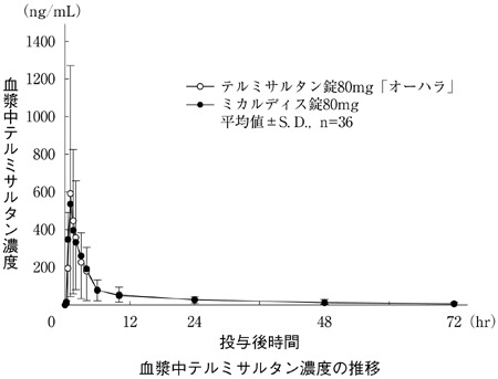 テルミサルタン錠80mg「オーハラ」とミカルディス錠80mgを、クロスオーバー法によりそれぞれ1錠(テルミサルタンとして80mg)健康成人男子に絶食単回経口投与して血漿中未変化体濃度を測定した。得られた薬物動態パラメータ(AUC、Cmax)について統計解析を行った結果、評価パラメータの対数値の平均値の差がlog(0.90)~log(1.11)であり、且つ、溶出試験で溶出挙動が類似していることから両剤の生物学的同等性が確認された12) 。