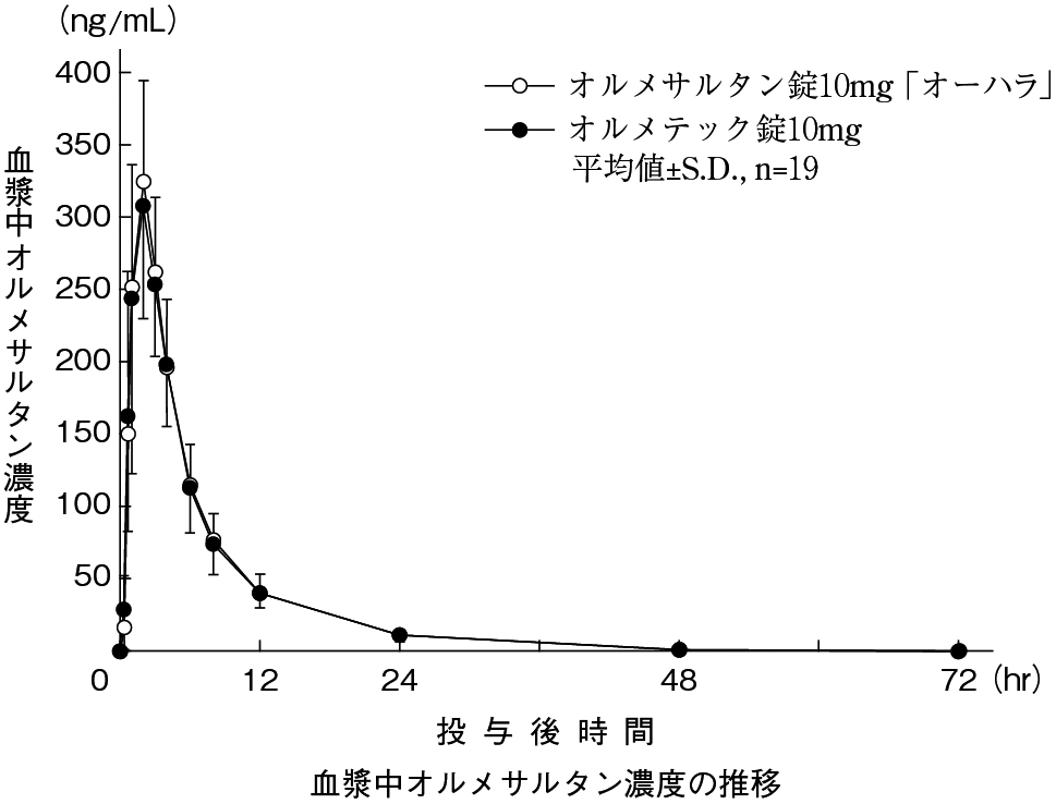 オルメサルタン錠10mg「オーハラ」とオルメテック錠10mgを、クロスオーバー法によりそれぞれ1錠(オルメサルタン メドキソミルとして10mg)健康成人男子に絶食単回経口投与して血漿中オルメサルタン(活性代謝物)濃度を測定した。得られた薬物動態パラメータ(AUC、Cmax)について90%信頼区間法にて統計解析を行った結果、log(0.80)~log(1.25)の範囲内であり、両剤の生物学的同等性が確認された7) 。
