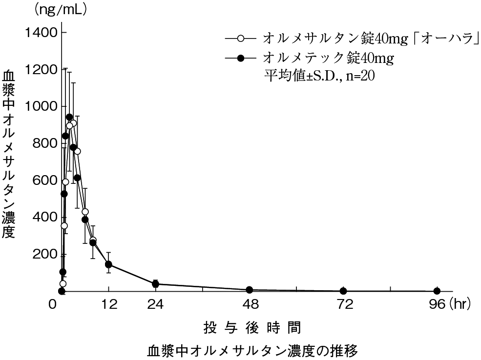 オルメサルタン錠40mg「オーハラ」とオルメテック錠40mgを、クロスオーバー法によりそれぞれ1錠(オルメサルタン メドキソミルとして40mg)健康成人男子に絶食単回経口投与して血漿中オルメサルタン(活性代謝物)濃度を測定した。得られた薬物動態パラメータ(AUC、Cmax)について90%信頼区間法にて統計解析を行った結果、log(0.80)~log(1.25)の範囲内であり、両剤の生物学的同等性が確認された7) 。