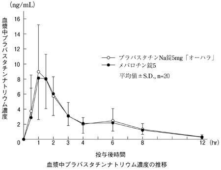 プラバスタチンNa錠5mg「オーハラ」とメバロチン錠5を、クロスオーバー法によりそれぞれ1錠(プラバスタチンナトリウムとして5mg)健康成人男子に絶食単回経口投与して血漿中プラバスタチンナトリウム濃度を測定し、得られた薬物動態パラメータ(AUC、Cmax)について統計解析を行った結果、両剤の生物学的同等性が確認された。2)