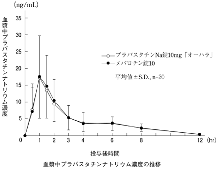 プラバスタチンNa錠10mg「オーハラ」とメバロチン錠10を、クロスオーバー法によりそれぞれ1錠(プラバスタチンナトリウムとして10mg)健康成人男子に絶食単回経口投与して血漿中プラバスタチンナトリウム濃度を測定し、得られた薬物動態パラメータ(AUC、Cmax)について統計解析を行った結果、両剤の生物学的同等性が確認された。3)