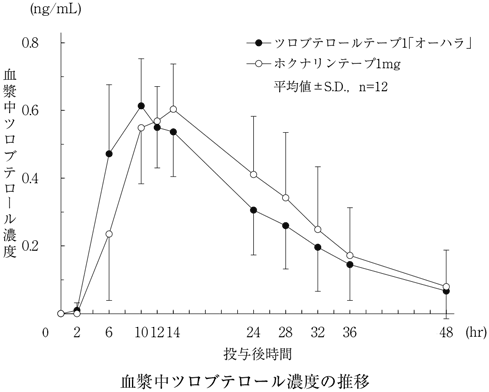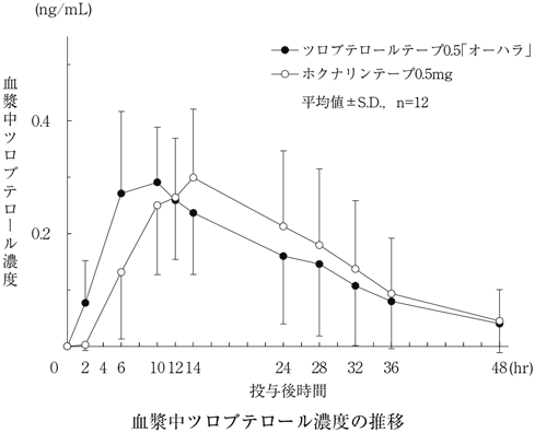 健康成人男子にツロブテロールテープ0.5「オーハラ」とホクナリンテープ0.5mgを、それぞれ1枚(ツロブテロールとして、それぞれ0.5mg)注)クロスオーバー法を用い、胸部に単回経皮投与(24時間貼付)した場合の血漿中ツロブテロール濃度推移は下記の通りであった。AUCとCmaxを指標パラメータとした生物学的同等性の解析の結果、両製剤は生物学的に同等であることが示された3)。