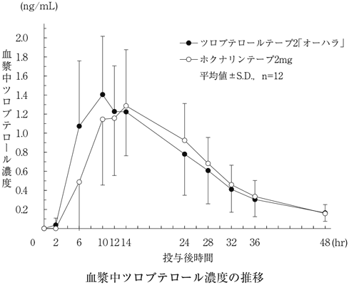 健康成人男子にツロブテロールテープ2「オーハラ」とホクナリンテープ2mgを、それぞれ1枚(ツロブテロールとして、それぞれ2mg)注)クロスオーバー法を用い、胸部に単回経皮投与(24時間貼付)した場合の血漿中ツロブテロール濃度推移は下記の通りであった。AUCとCmaxを指標パラメータとした生物学的同等性の解析の結果、両製剤は生物学的に同等であることが示された3)。