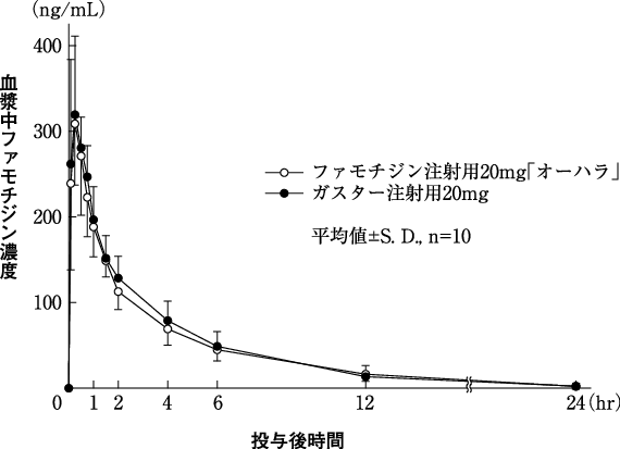 ファモチジン注射用20mg「オーハラ」とガスター注射用20mgを、クロスオーバー法によりそれぞれ1管(ファモチジンとして20mg)健康成人男子に絶食単回筋肉内投与して血漿中未変化体濃度を測定し、得られた薬物動態パラメータ(AUC、Cmax)について統計解析を行った結果、両剤の生物学的同等性が確認された4)。
