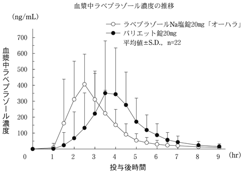 ラベプラゾールNa塩錠20mg「オーハラ」とパリエット錠20mgを、クロスオーバー法によりそれぞれ1錠(ラベプラゾールナトリウムとして20mg)健康成人男子に絶食単回経口投与して血漿中未変化体濃度を測定した。得られた薬物動態パラメータ(AUC、Cmax)について90%信頼区間法にて統計解析を行った結果、log(0.80)~log(1.25)の範囲内であり、両剤の生物学的同等性が確認された3)。