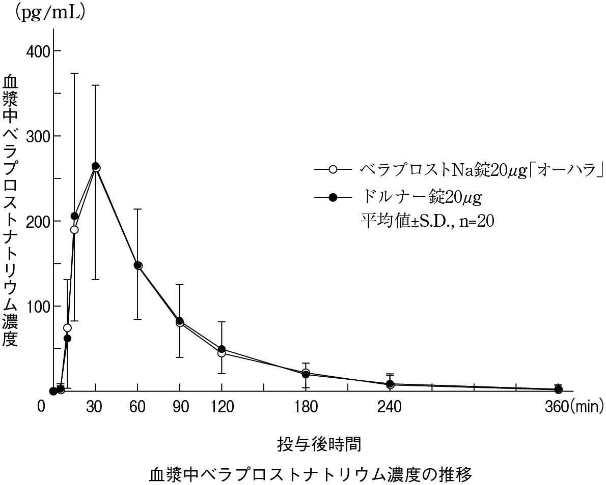 ベラプロストNa錠20μg「オーハラ」とドルナー錠20μgを、クロスオーバー法によりそれぞれ1錠(ベラプロストナトリウムとして20μg)健康成人男子に絶食単回経口投与して血漿中未変化体濃度を測定し、得られた薬物動態パラメータ(AUC、Cmax)について統計解析を行った結果、両剤の生物学的同等性が確認された5) 。