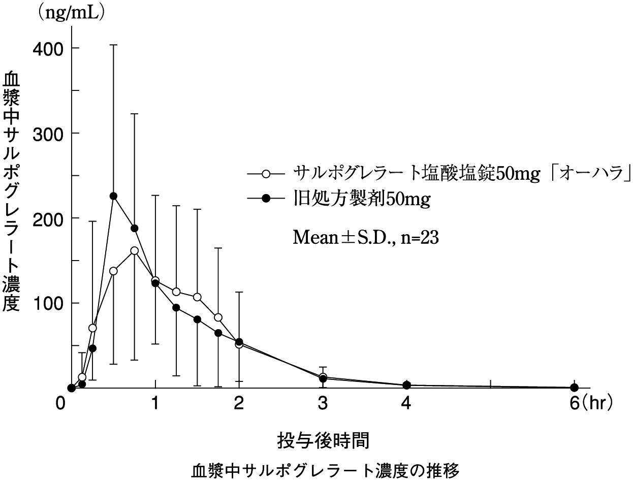 「経口固形製剤の処方変更の生物学的同等性試験ガイドライン」(平成24年2月29日 薬食審査発0229第10号)に基づき、新処方製剤のサルポグレラート塩酸塩錠50mg「オーハラ」と、ヒトを対象とした生物学的同等性試験によりアンプラーグ錠50mgとの同等性が確認された旧処方製剤を、クロスオーバー法によりそれぞれ1錠(サルポグレラート塩酸塩としてそれぞれ50mg)健康成人男子に絶食単回経口投与して血漿中未変化体濃度を測定し、得られた薬物動態パラメータ(AUC、Cmax)について統計解析を行った結果、両剤の生物学的同等性が確認された1),2) 。