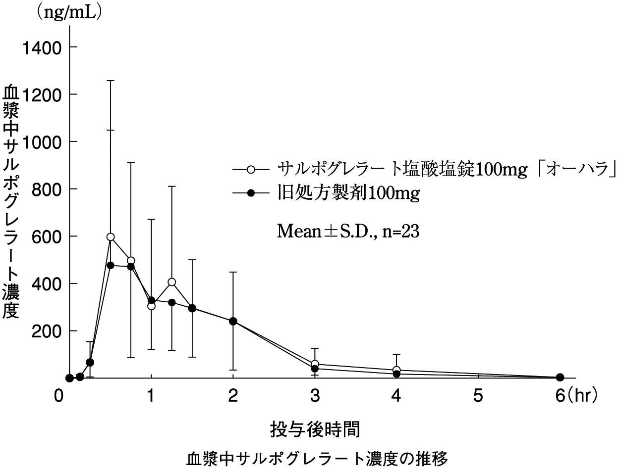 「経口固形製剤の処方変更の生物学的同等性試験ガイドライン」(平成18年11月24日 薬食審査発第1124004号)に基づき、新処方製剤のサルポグレラート塩酸塩錠100mg「オーハラ」と、ヒトを対象とした生物学的同等性試験によりアンプラーグ錠100mgとの同等性が確認された旧処方製剤を、クロスオーバー法によりそれぞれ1錠(サルポグレラート塩酸塩としてそれぞれ100mg)健康成人男子に絶食単回経口投与して血漿中未変化体濃度を測定し、得られた薬物動態パラメータ(AUC、Cmax)について統計解析を行った結果、両剤の生物学的同等性が確認された1),2) 。