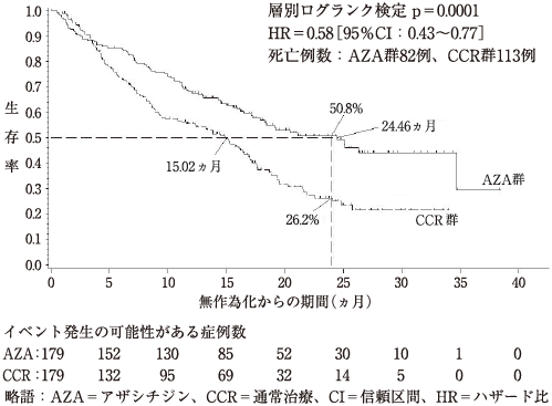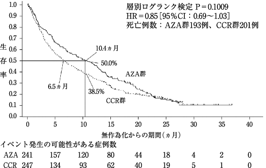 主要評価項目である生存期間(中央値)は、CCR群15.02ヵ月に対し、AZA群24.46ヵ月であり9.44ヵ月の差が認められた(層別ログランク検定、p=0.0001)14)。