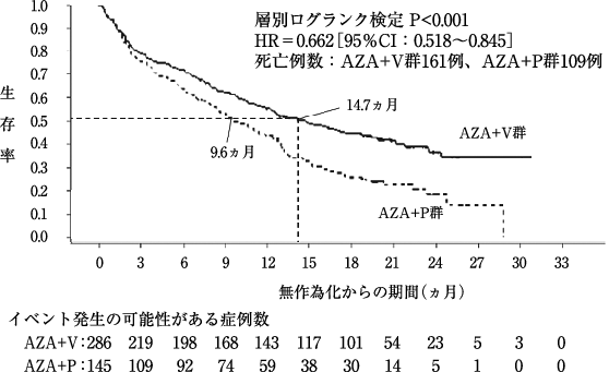 強力な寛解導入療法の適応とならない未治療のAML患者に対し、ベネトクラクスとの併用(AZA+V群)又はプラセボとの併用(AZA+P群)で、本剤75mg/m2を1日1回7日間(28日毎)皮下投与又は静脈内投与した。ベネトクラクス及びプラセボは、第1、2及び3日目にそれぞれベネトクラクス100、200及び400mg又はプラセボを1日1回食後に経口投与した後、ベネトクラクス400mg又はプラセボを1日1回継続投与した。 433例(日本人患者37例を含む)がAZA+V群287例、AZA+P群146例に割り付けられた。 主要評価項目である全生存期間(中央値)は、AZA+P群9.6ヵ月(95%信頼区間:7.4~12.7ヵ月)に対し、AZA+V群14.7ヵ月(95%信頼区間:11.9~18.7ヵ月)であり(ハザード比:0.662、層別ログランク検定、p<0.001)、AZA+V群はAZA+P群に対して統計学的に有意な延長を認めた16),注21)。もう1つの主要評価項目である治験責任医師判定の複合的完全寛解(完全寛解[CR]+血球数回復が不完全な完全寛解[CRi])率は、AZA+P群25.3%(20/79例、95%信頼区間:16.2~36.4%)に対し、AZA+V群で65.3%(96/147例、95%信頼区間:57.0~73.0%)であり(Cochran-Mantel-Haenszel検定、p<0.001)、AZA+V群はAZA+P群に対して統計学的に有意に高値であった注22)。