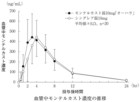 モンテルカスト錠10mg「オーハラ」とシングレア錠10mgを、クロスオーバー法によりそれぞれ1錠(モンテルカストとして10mg)健康成人男子に絶食単回経口投与して血漿中未変化体濃度を測定した。得られた薬物動態パラメータ(AUC、Cmax)について、90%信頼区間法にて統計解析を行った結果、log(0.80)~log(1.25)の範囲内であり、両剤の生物学的同等性が確認された4)。