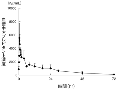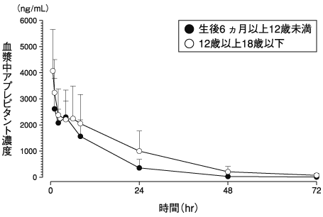 12歳以上18歳以下の小児悪性腫瘍患者11例に本剤150mgを30分間かけて静脈内投与した時、アプレピタントのCmax、AUC0-∞及び消失半減期(T1/2)はそれぞれ4,070ng/mL、61,100ng・hr/mL及び10.1時間であった。生後6ヵ月以上12歳未満の小児悪性腫瘍患者15例に本剤3.0mg/kgを60分間かけて静脈内投与した時、アプレピタントのCmax、AUC0-∞及び消失半減期(T1/2)はそれぞれ3,020ng/mL、35,200ng・hr/mL及び5.69時間であった。2)