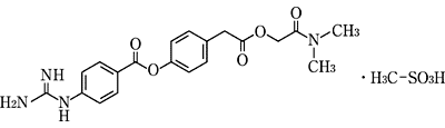 本剤は、先ずカルボン酸エステルが加水分解されて活性代謝物4-(4-グアニジノベンゾイルオキシ)フェニル酢酸になり、更に4-グアニジノ安息香酸にまで加水分解される。4)本剤は主にカルボキシエステラーゼにより、活性代謝物4-(4-グアニジノベンゾイルオキシ)フェニル酢酸は主にアリルエステラーゼにより加水分解される(in vitro)。5)また、本剤及びその活性代謝物4-(4-グアニジノベンゾイルオキシ)フェニル酢酸は、ヒトのチトクロームP450の分子種(CYP1A2、CYP2C9、CYP2C19、CYP2D6及びCYP3A4)を阻害しなかった(in vitro)。6)