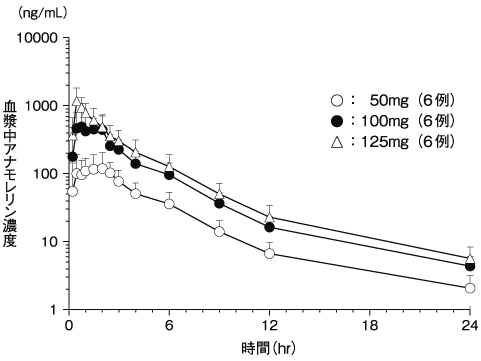 日本人健康成人(6例)に本剤50~125mg注)を空腹時に単回経口投与したときのアナモレリンの血漿中濃度推移及び薬物動態パラメータを以下に示す。なお、本剤50~125mg注)の範囲で用量比以上の曝露の増加が認められた3)。