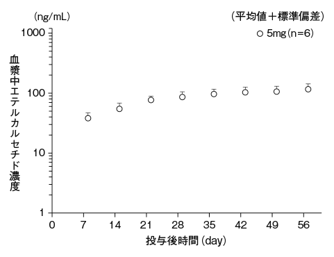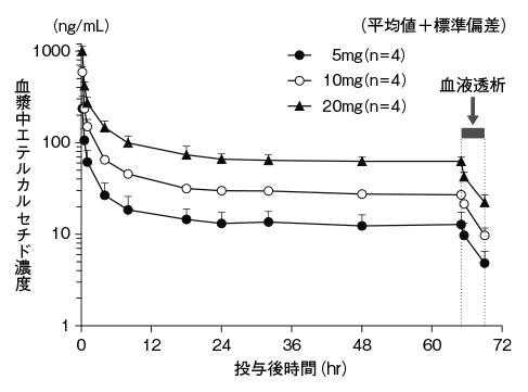 日本人の血液透析下の慢性腎臓病患者に本剤5、10及び20mgを透析終了後に単回静脈内投与したときの血漿中エテルカルセチド濃度推移及びAUCは以下の通りであった。血漿中エテルカルセチド濃度は投与直後から速やかに低下したが、投与後24時間から次回透析まで概ね一定の濃度で推移した。1)投与後65時間から69時間まで血液透析を実施した結果、透析直後の血漿中エテルカルセチド濃度は透析直前の35~38%であった。本剤のAUCは用量に比例して増加した。2)