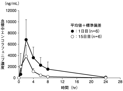 エンコラフェニブは、A375細胞株及びCOLO 205細胞株を皮下移植したヌードマウスにおいて、腫瘍増殖抑制作用を示した32),33)。また、エンコラフェニブとビニメチニブとの併用により、各薬剤単独と比較して、BRAF V600E変異を有するヒト悪性黒色腫患者由来HMEX1906腫瘍組織片を皮下移植したヌードマウスにおける腫瘍増殖抑制作用が増強した34)。さらに、①エンコラフェニブとセツキシマブとの併用、並びに②エンコラフェニブ、ビニメチニブ及びセツキシマブの併用により、①セツキシマブ単独及び②エンコラフェニブ又はセツキシマブ単独と比較して、HT-29細胞株を皮下移植したヌードマウスにおける腫瘍増殖抑制作用がそれぞれ増強した35)。