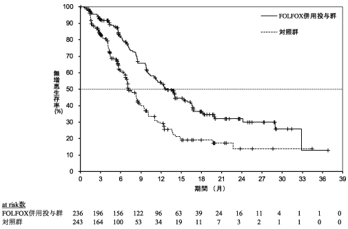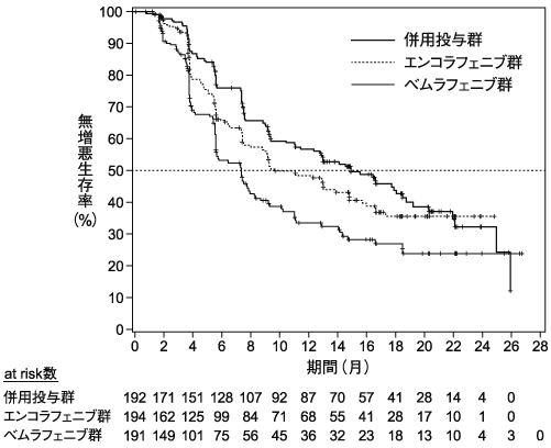 化学療法歴のないBRAF V600E変異を有する治癒切除不能な進行・再発の結腸・直腸癌患者637例(日本人患者70例を含む。本剤※14、セツキシマブ※15及びFOLFOX※16の併用投与[FOLFOX 併用投与群]236例、本剤※14とセツキシマブ※15の併用投与群158例、治験担当医師により無作為化前に選択された化学療法(FOLFOX※16、CAPOX※17、FOLFOXIRI※18、FOLFOX※16及びベバシズマブ※19の併用投与、CAPOX※17及びベバシズマブ※19の併用投与又はFOLFOXIRI※18及びベバシズマブ※19の併用投与)[対照群]243例)を対象とした第Ⅲ相パートにおいて、対照群に対するFOLFOX併用投与群の有効性及び安全性を検討した。主要評価項目である独立中央判定による無増悪生存期間及び奏効率の結果を以下に示す。対照群に対してFOLFOX併用投与群は、無増悪生存期間を統計学的に有意に延長し(2025年1月6日データカットオフ)、奏効率は統計学的に有意に高値であった(2023年12月22日データカットオフ)23)。また、FOLFOX併用投与群において安全性評価対象となった232例中232例(100%)に副作用(臨床検査値の異常を含む)が認められた。主な副作用は、悪心116例(50.0%)、貧血78例(33.6%)、好中球数減少77例(33.2%)、嘔吐77例(33.2%)、食欲減退75例(32.3%)、下痢64例(27.6%)、発疹64例(27.6%)、末梢性ニューロパチー62例(26.7%)、末梢性感覚ニューロパチー62例(26.7%)、疲労56例(24.1%)、好中球減少症55例(23.7%)、無力症55例(23.7%)、脱毛症53例(22.8%)、血小板数減少52例(22.4%)、関節痛47例(20.3%)であった。,※14:300mgを1日1回投与※15:2週間を1サイクルとして、第1日目に500mg/m2を120分かけて静脈内投与※16:4週間を1サイクルとして、第1日目及び第15日目に①ホリナート400mg/m2又はレボホリナート200mg/m2を120分かけて静脈内投与、②オキサリプラチン85mg/m2を120分かけて静脈内投与、③フルオロウラシル400mg/m2を急速静脈内投与した後、フルオロウラシル2,400mg/m2を46~48時間かけて静脈内投与※17:3週間を1サイクルとして、第1日目にオキサリプラチン130mg/m2を120分かけて静脈内投与、第1日目から第14日目にカペシタビン1,000mg/m2を1日2回経口投与※18:4週間を1サイクルとして、第1日目及び第15日目に①イリノテカン165mg/m2を90分かけて静脈内投与、②ホリナート400mg/m2又はレボホリナート200mg/m2を120分かけて静脈内投与、③オキサリプラチン85mg/m2を120分かけて静脈内投与、④フルオロウラシル2,400mg/m2又は3,200mg/m2を46~48時間かけて静脈内投与※19:用法・用量は各国・地域の添付文書に従うこととされた