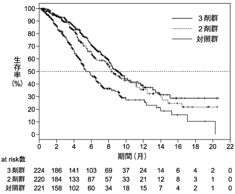 なお、部分集団解析による2剤群に対する3剤群のハザード比[95%信頼区間]※13は、ECOG PS1の集団(3剤群109例、2剤群107例)で0.71[0.51,0.99]、転移臓器数≧3の集団(3剤群111例、2剤群103例)で0.63[0.45,0.90]、CRP値>1mg/dLの集団(3剤群95例、2剤群79例)で0.65[0.46,0.92]、原発巣が未切除又は不完全切除の集団(3剤群91例、2剤群97例)で0.55[0.38,0.79]であり、3剤群でOSが良好な傾向が認められた。一方、ECOG PS 0の集団(3剤群115例、2剤群113例;0.99[0.66,1.47])、転移臓器数≦2の集団(3剤群113例、2剤群117例;1.04[0.72,1.50])、CRP値≦1mg/dLの集団(3剤群122例、2剤群139例);1.02[0.71,1.46])、原発巣が完全切除の集団(3剤群133例、2剤群123例);1.00[0.71,1.41])では、2剤群と3剤群のOSは同程度であった(2019年8月15日データカットオフ)。※13:全体集団において単変量Cox回帰モデル等により同定された、OSに影響を及ぼすと考えられる5つの患者背景因子(CRP値>1mg/dL、肝転移あり、CEA値>5μg/L、CA19-9値>35U/mL及び転移臓器数≧3)で調整した結果