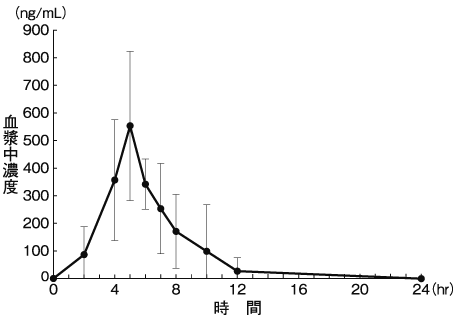 健康成人5例に225mgを食後に単回経口投与すると、血漿中濃度は約5時間で最高に達し、その濃度は642ng/mLで、血漿中半減期は約1.2時間である。1)