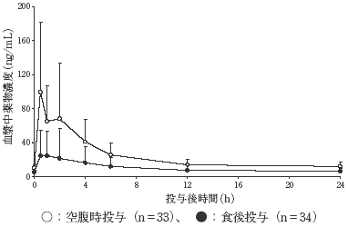 本剤服用時期は患者ごとに食後又は食前(空腹時)のいずれかに規定し、原則として毎日同じ条件で服用するよう指導すること。なお、本剤は、食前(空腹時)投与で食後投与に比べ血中濃度が高くなること等を踏まえ、食後投与での開始を考慮すること。本剤服用時期を変更する場合には症状の変化に特に注意すること。