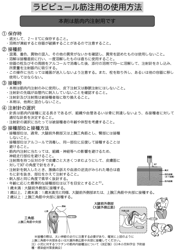1.0mLを1回量として、適切な間隔をおいて3回筋肉内に接種する。
