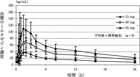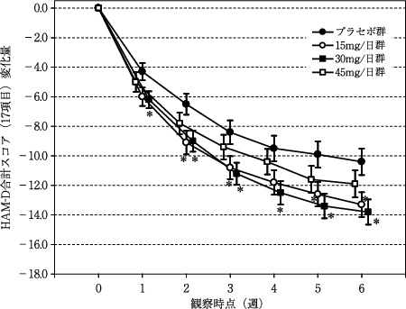 うつ病患者を対象とした6週間の無作為化二重盲検比較試験を実施した。すべての本剤投与群で初期用量は15mg/日とし、30mg/日群及び45mg/日群は2週目に30mgへ強制増量、45mg/日群は3週目に45mgへ強制増量し、各群共に増量後は用量を維持した。本剤15mg/日群及び30mg/日群の、投与終了(中止)時のHAM-D合計スコア(17項目)の投与開始前からの変化量(LOCF)はプラセボ群に比較して有意に大きかった。なお、本剤45mg/日群での効果は、30mg/日群を上回るものではなかった17)。