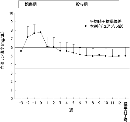 高リン血症を有する腹膜透析中の慢性腎不全患者44例を対象に、スクロオキシ水酸化鉄チュアブル錠を1日750mgから投与開始し、1日3000mgまでの範囲で適宜増減して12週間投与した。その結果、血清リン濃度は投与開始時7.38±0.90mg/dLから投与終了時5.34±0.89mg/dLに低下が認められた。投与12週までのスクロオキシ水酸化鉄チュアブル錠の平均1日用量は1169mgであった。このうち23例を対象に28週まで継続投与した結果、投与終了時の血清リン濃度は4.92±0.95mg/dLであり、低下が維持された。また、血清フェリチン濃度は投与開始時99.36±82.67ng/mL、投与28週時269.04±113.30ng/mL及び投与終了時273.91±113.13ng/mLであった。副作用発現割合は40.9%(18/44例)であった。高頻度に認められた副作用(2例以上に発現)は、「下痢」9例、「便秘」、「ALT増加」及び「AST増加」各2例であった7)。