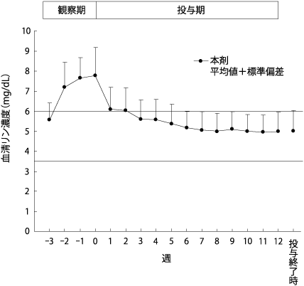 高リン血症を有する腹膜透析中の慢性腎不全患者44例を対象に、本剤を1日750mgから投与開始し、1日3000mgまでの範囲で適宜増減して12週間投与した。その結果、血清リン濃度は投与開始時7.38±0.90mg/dLから投与終了時5.34±0.89mg/dLに低下が認められた。投与12週までの本剤の平均1日用量は1169mgであった。このうち23例を対象に28週まで継続投与した結果、投与終了時の血清リン濃度は4.92±0.95mg/dLであり、低下が維持された。また、血清フェリチン濃度は投与開始時99.36±82.67ng/mL、投与28週時269.04±113.30ng/mL及び投与終了時273.91±113.13ng/mLであった。副作用発現割合は40.9%(18/44例)であった。高頻度に認められた副作用(2例以上に発現)は、「下痢」9 例、「便秘」、「ALT増加」及び「AST増加」各2例であった7)。