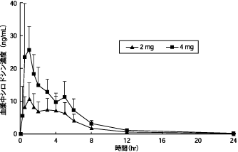 健康成人男性(各群6例)にシロドシン0.5mgから12mg(カプセル)を単回経口投与したとき注2)、血漿中シロドシン濃度は投与量の増加に伴って上昇し、Cmax及びAUC0-∞は線形性を示した4)。シロドシン2mg又は4mg(カプセル)を単回経口投与したときの血漿中シロドシン濃度推移は図1に示すとおりであった5),6)。