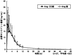健康成人男性にシロドシン4mg(錠又はカプセル)を空腹時に単回経口投与したとき注2)の血漿中シロドシン濃度及び薬物動態パラメータは表1に示すとおりであり、4mg錠及び4mgカプセルは生物学的に同等であった3)。