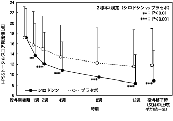 前立腺肥大症に伴う排尿障害患者を対象に、シロドシンカプセル1回4mg1日2回又はプラセボを12週間経口投与した結果、終了時のI-PSSトータルスコアは投与開始時に比較して、シロドシンで8.3及びプラセボで5.3それぞれ低下した(図4、表9)。また、投与開始時に比較してI-PSSトータルスコアが25%以上改善した症例の割合は、シロドシン76.4%(133/174例)及びプラセボ50.6%(45/89例)であり、重症度が軽症(I-PSSトータルスコア8未満)まで改善した症例の割合は、シロドシン47.7%(83/174例)及びプラセボ31.5%(28/89例)であった。シロドシンでは自覚症状は投与1週後の早期から改善し、重症例に対しても改善効果が認められた。副作用発現割合は、シロドシン群54.9%(96/175例)、プラセボ群22.5%(20/89例)であった。主な副作用は、シロドシン群で射精障害22.3%(39/175例)、軟便及び口渇各8.6%(15/175例)、尿失禁5.7%(10/175例)、下痢4.6%(8/175例)、鼻閉4.0%(7/175例)、プラセボ群で軟便、口渇及び頭痛各4.5%(4/89例)であった。副作用(臨床検査値)発現割合は、シロドシン群31.4%(55/175例)、プラセボ群21.6%(19/88例)であった。主な副作用(臨床検査値)は、シロドシン群ではトリグリセリド上昇12.0%(21/175例)、CRP上昇5.7%(10/175例)、γ-GTP上昇3.4%(6/175例)、プラセボ群ではトリグリセリド上昇10.2%(9/88例)、LDH上昇及びCRP上昇各3.4%(3/88例)であった11)。