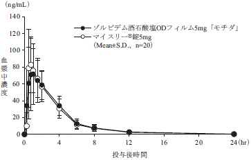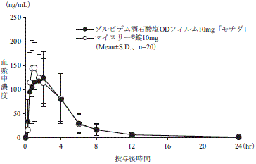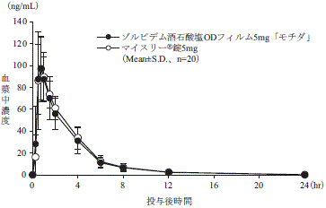 ゾルピデム酒石酸塩ODフィルム5mg「モチダ」とマイスリーⓇ錠5mgを、クロスオーバー法により1枚又は1錠(ゾルピデム酒石酸塩として5mg)健康成人男性に絶食単回経口投与して血漿中未変化体濃度を測定し、得られた薬物動態パラメータ(AUC、Cmax)について90%信頼区間法にて統計解析を行った結果、log(0.80)~log(1.25)の範囲内であり、両剤の生物学的同等性が確認された2) 。