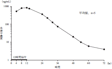フェルビナク貼付剤4枚(1枚中にフェルビナク70mgを含有)を健康成人男性5例の背部に12時間単回貼付したときのフェルビナクの平均血清中濃度及び薬物動態パラメータは、下図のような推移を示した1) 。